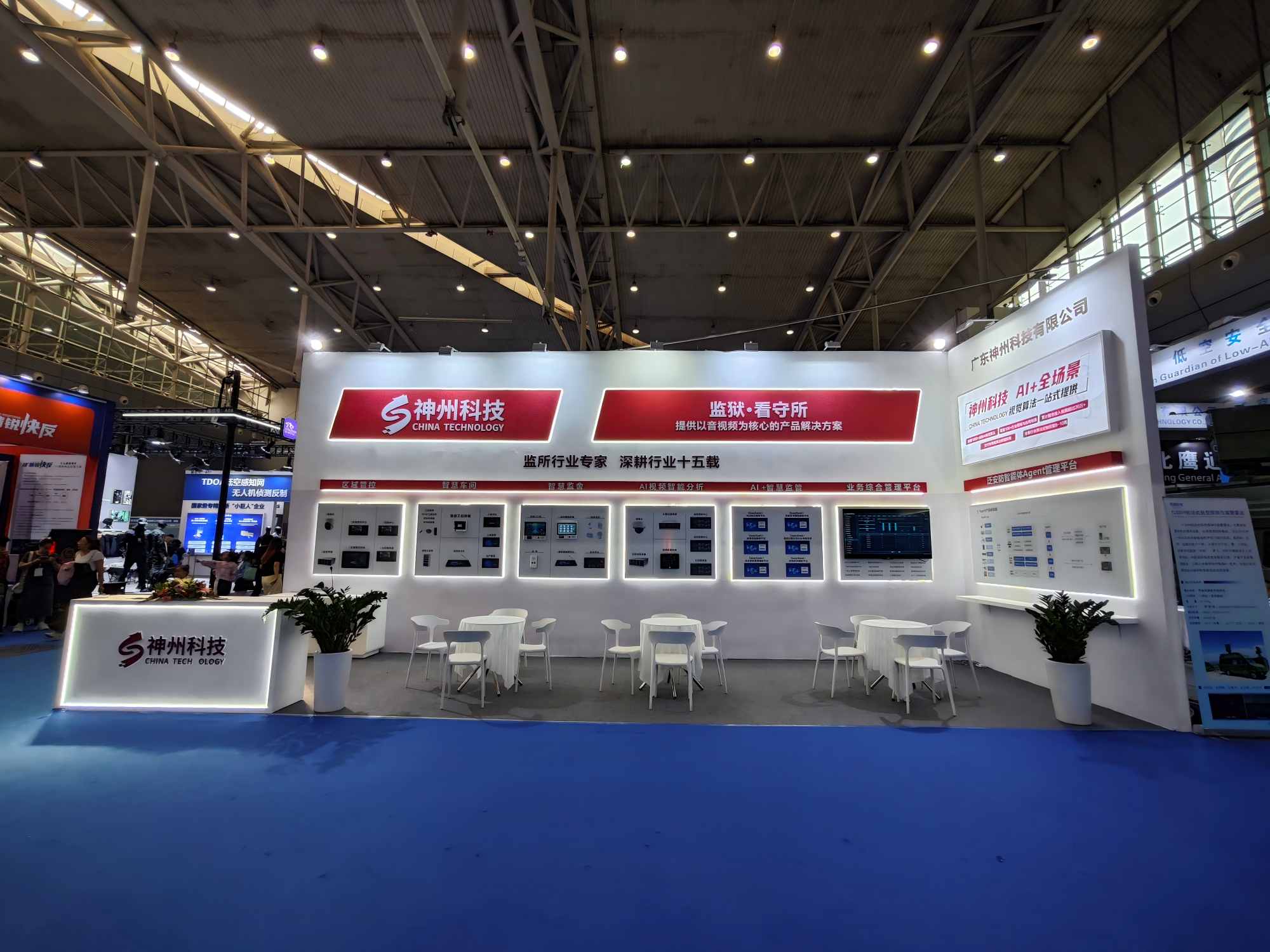 廣東神州科技有限公司應邀參加展會,本次展會展出神州科技自主研發軟硬件產品,包括“區域管控、智慧車間、智慧監舍、AI視頻智能分析、AI+智慧監管 、業務綜合管理平台、泛安防智能體管理平台"